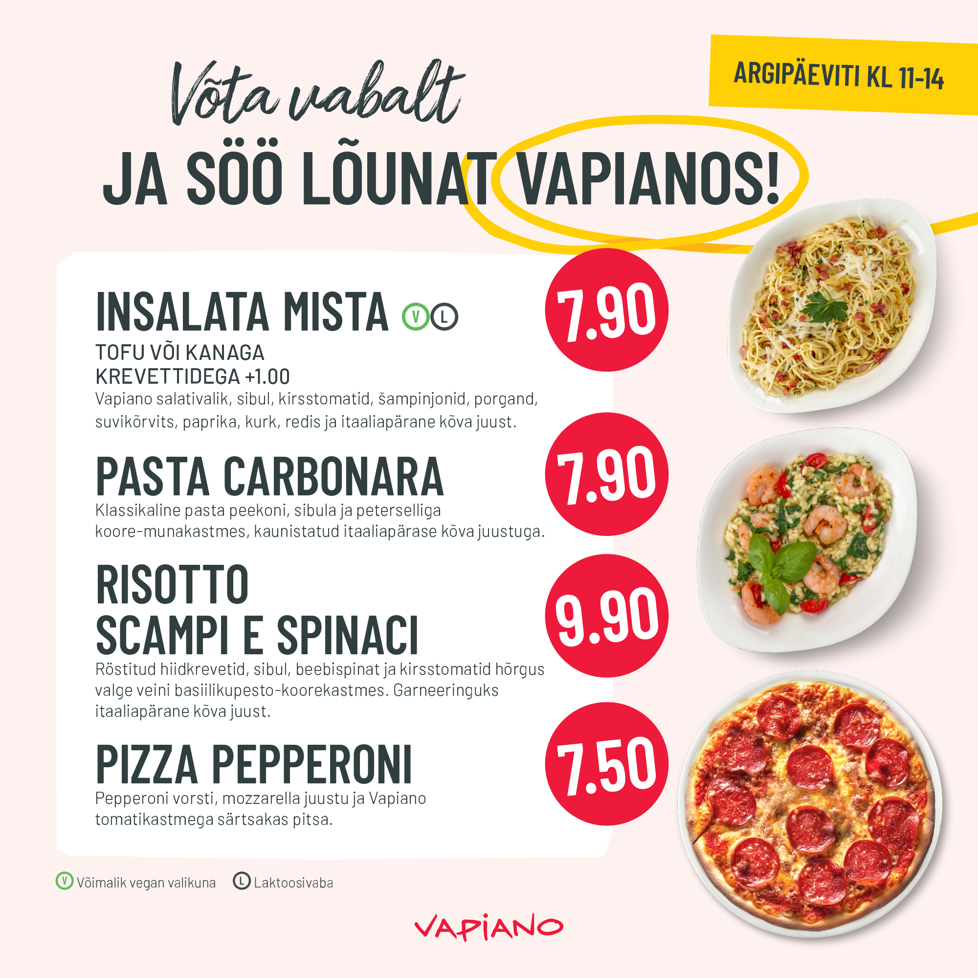 Vapianos on nutikas lõunat süüa, sest igal argipäeval kella 11-14 on valik roogasid lõunapakkumisena soodsa erihinnaga.
