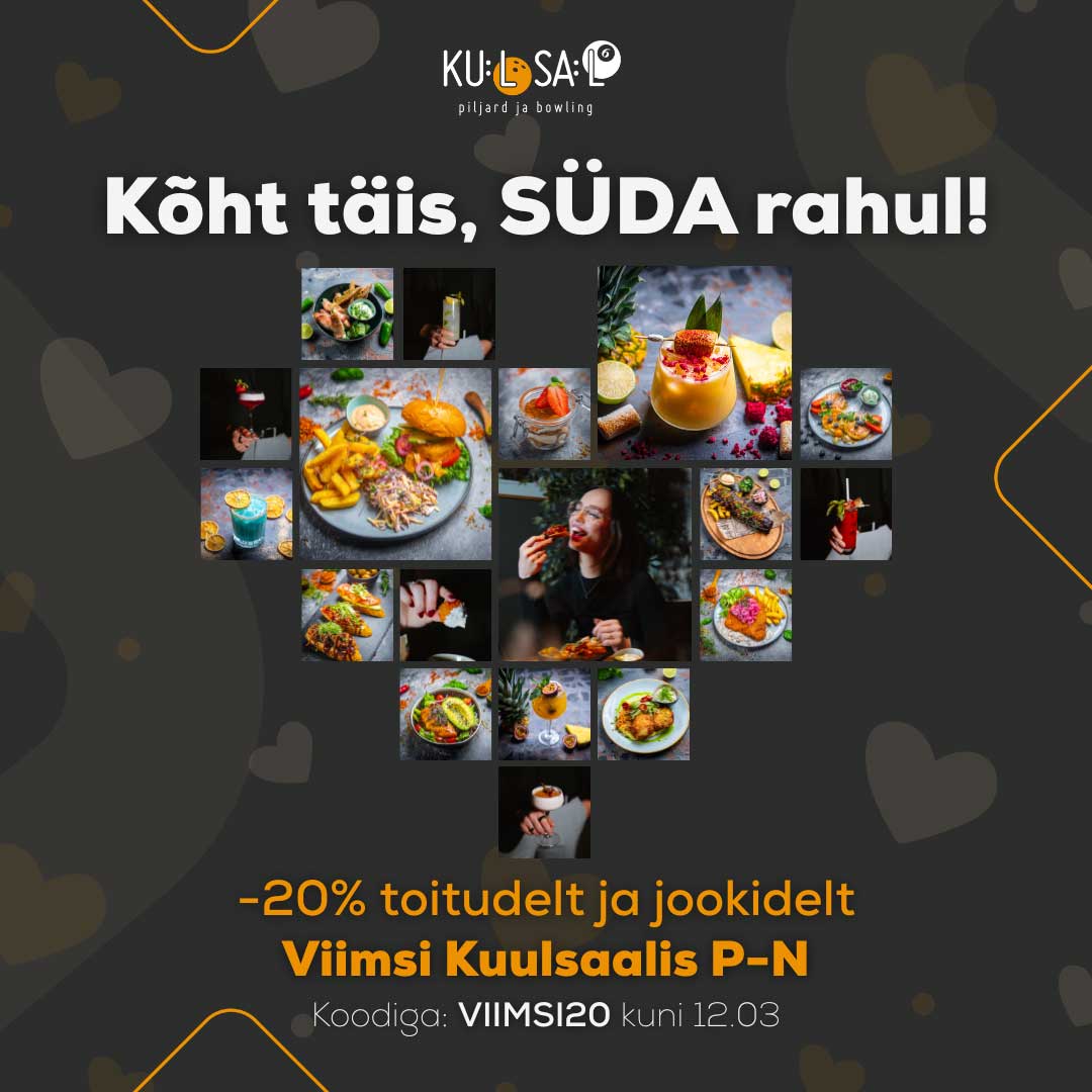 Pakkumine kehtib kuni 12.03 nii Viimsi Kuulsaalis kohapeal kui ka ette tellides. Ettetellimisel kasuta sooduskoodi “VIIMSI20”, Kuulsaalis kohapeal telli lauast QR-koodi kaudu.